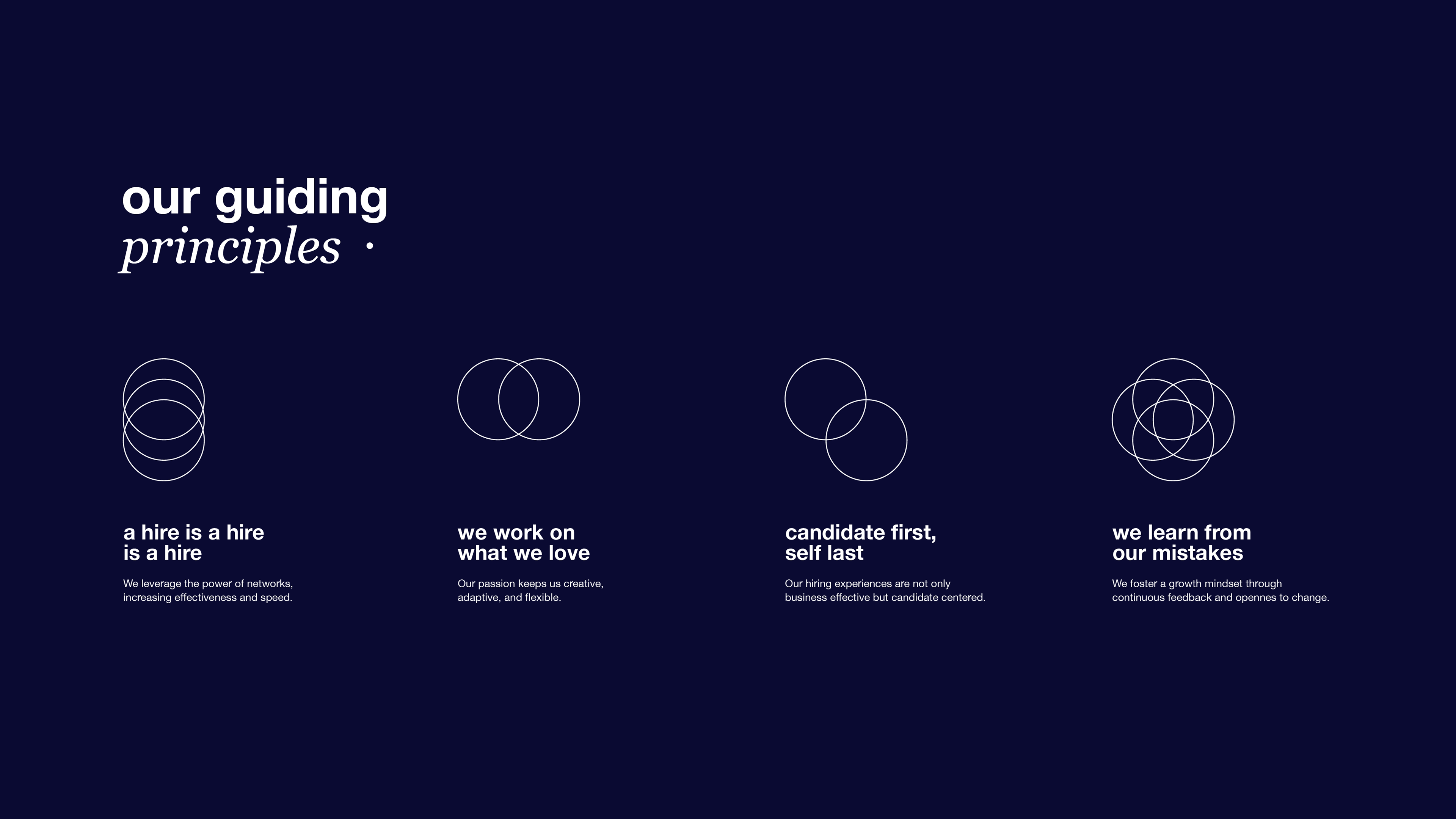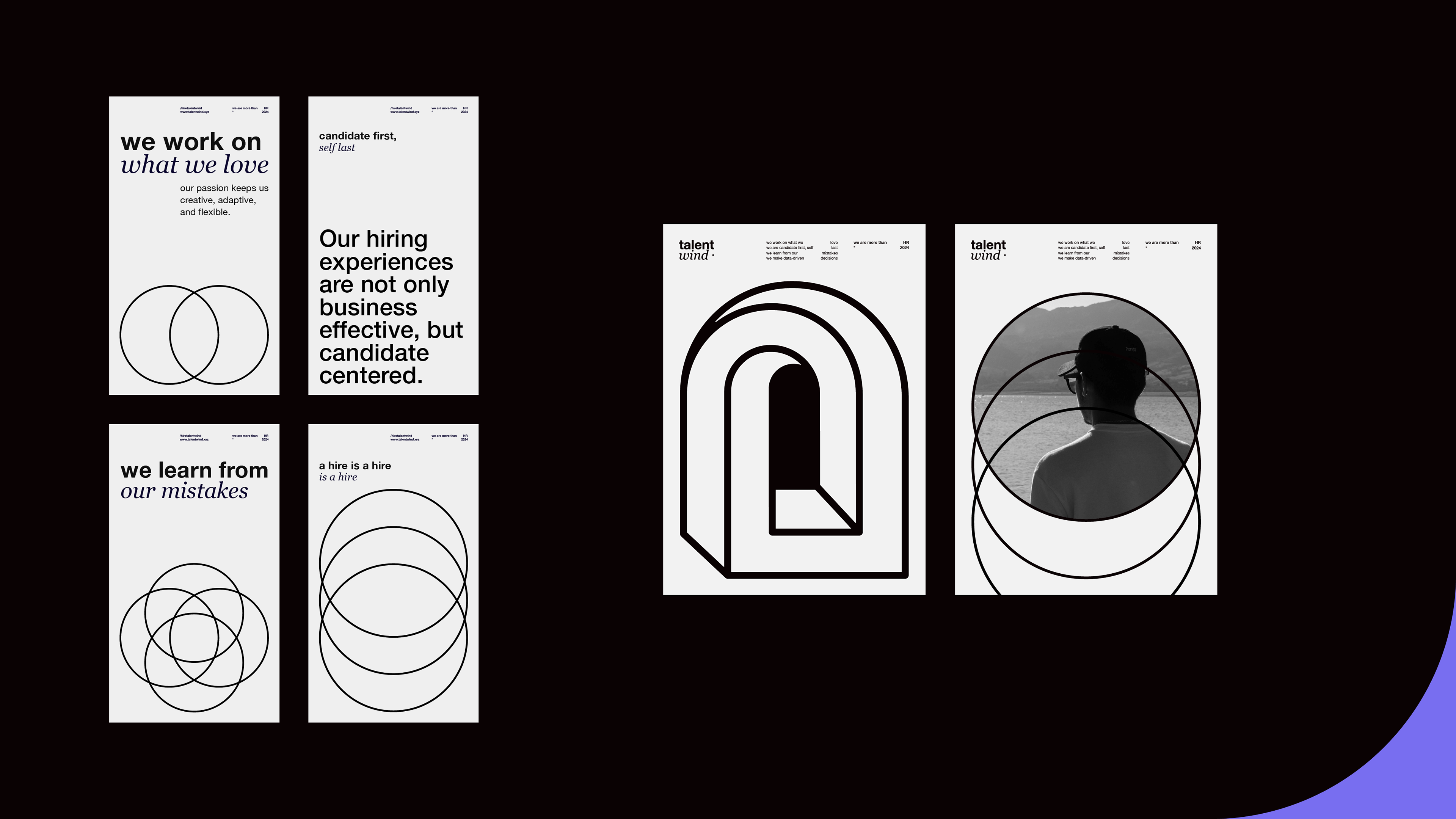 I represented talent with a minimalist visual system of circles as the primary element. These modular virtuous circles connect and intertwine in different ways to embody each brand value.
